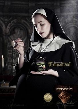 イタリアのジェラート風のアイスを製造販売するアントニオ・フェデリチ(Antonio Federici)が制作したポスターは、教会の中で身重の尼僧がアイスクリームの容器とスプーンをもって立っているというもの。「よく練られた」「アイスクリームはわたしたちの宗教だ」などの文言が書かれている。