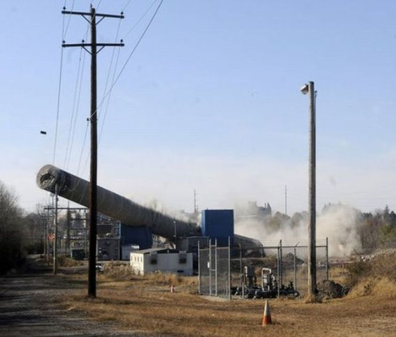 子どもたちがカウントダウンし、いよいよ盛り上がってまいりましたな解体現場。爆薬を使って83メートルの煙突を破壊するのが本日のメニューなんだけど、なんだか間違った方向に倒れちゃったみたいなんだ。